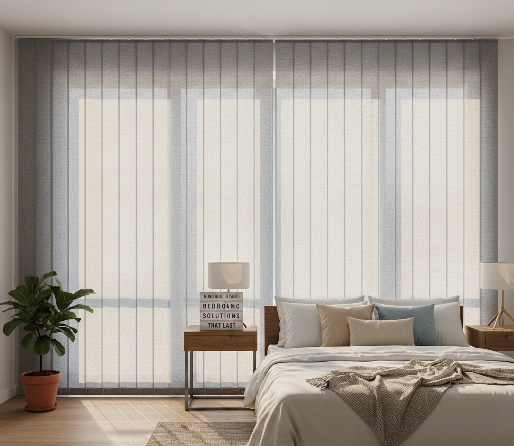 Zebra blinds combine sheer and solid bands for adjustable privacy but rarely achieve full blackout. Vertical blinds are less common in bedrooms and suit large glass areas rather than standard windows.