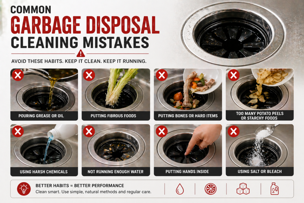 Many homeowners unknowingly make mistakes that either reduce cleaning effectiveness or create new problems. One of the most common errors is using hot water while running the disposal. While hot water helps dissolve grease temporarily, it allows it to travel deeper into the pipes where it cools and solidifies, leading to clogs. Another frequent mistake is relying only on deodorizing methods like lemon peels without actually removing buildup.