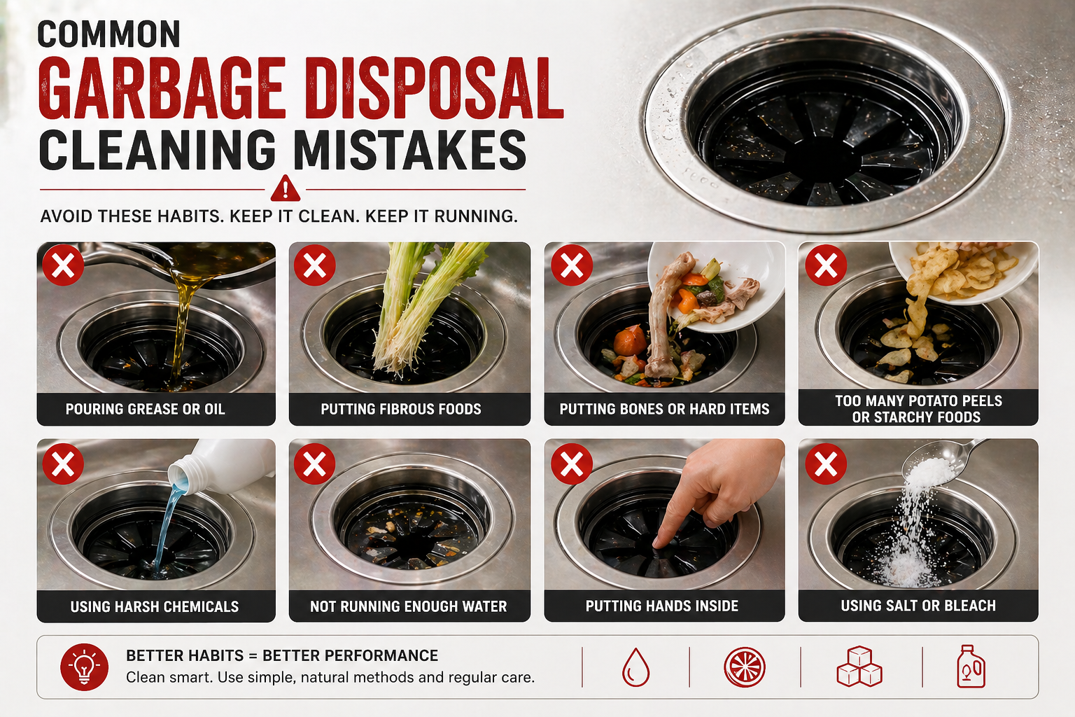 Most garbage disposal problems are caused by incorrect cleaning habits rather than lack of cleaning.