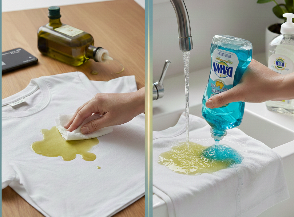 Olive oil stains aren’t permanent if you act in the right order. Absorb excess oil first, then break it down with dish soap using cold water only. Never apply heat until the stain is completely gone, or it will set permanently. Patience and fabric-safe methods beat aggressive scrubbing every time.