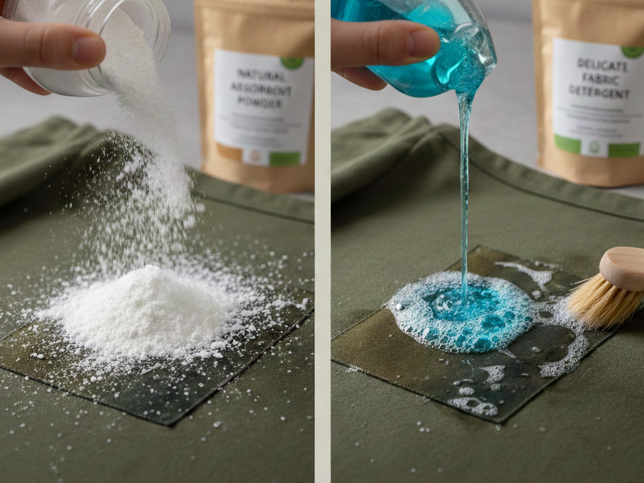 Using detergent without absorbing first often spreads the stain. Using absorbents alone may leave a shadow that darkens later.