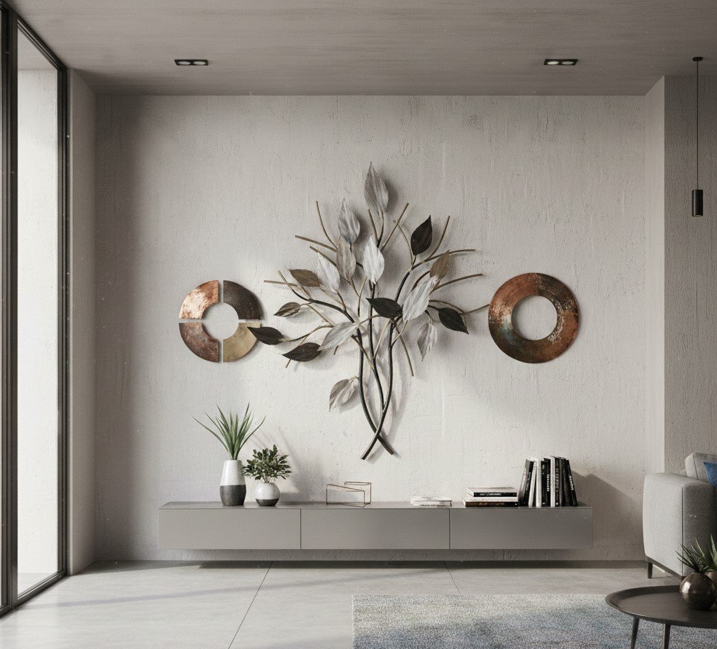 In neutral interiors, metal wall art often replaces color with form-based contrast, which feels more timeless than trend-based palettes.