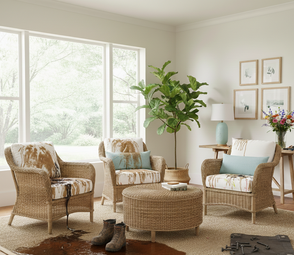 Seagrass furniture performs best when treated as a texture layer rather than a focal overload.